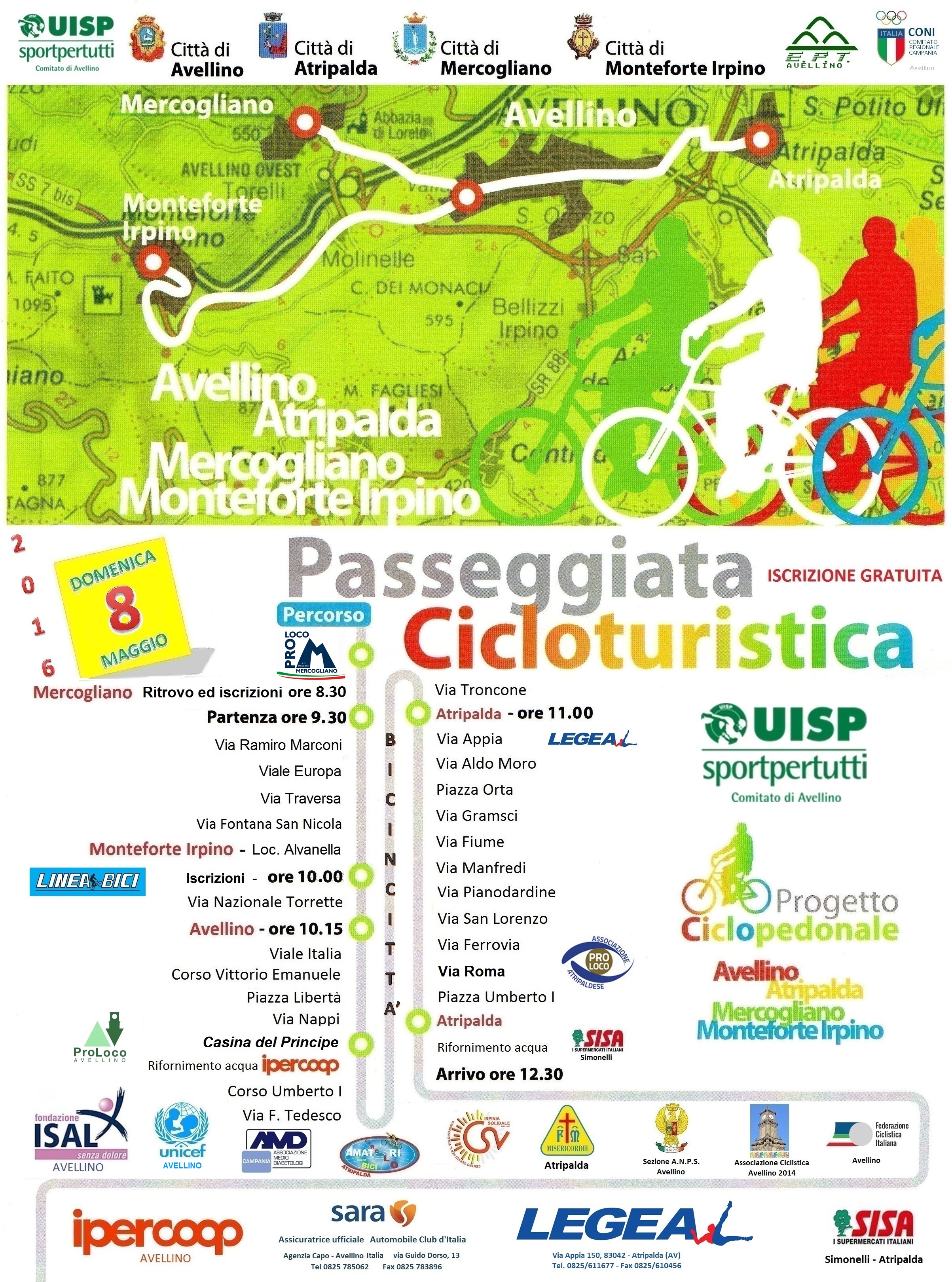 Anche quest’anno torna Bicincittà. La Sede Territoriale dell’Associazione Amici di ISAL di Avellino organizza in collaborazione con la UISP di Avellino Domenica 8 Maggio una Passeggiata Cicloturistica che partirà da Monteforte Irpino passando per Mercogliano e Avellino fino ad arrivare ad Atripalda. Il percorso, di 18 km, permetterà di osservare alcuni attrattori turistici delle cittadine.