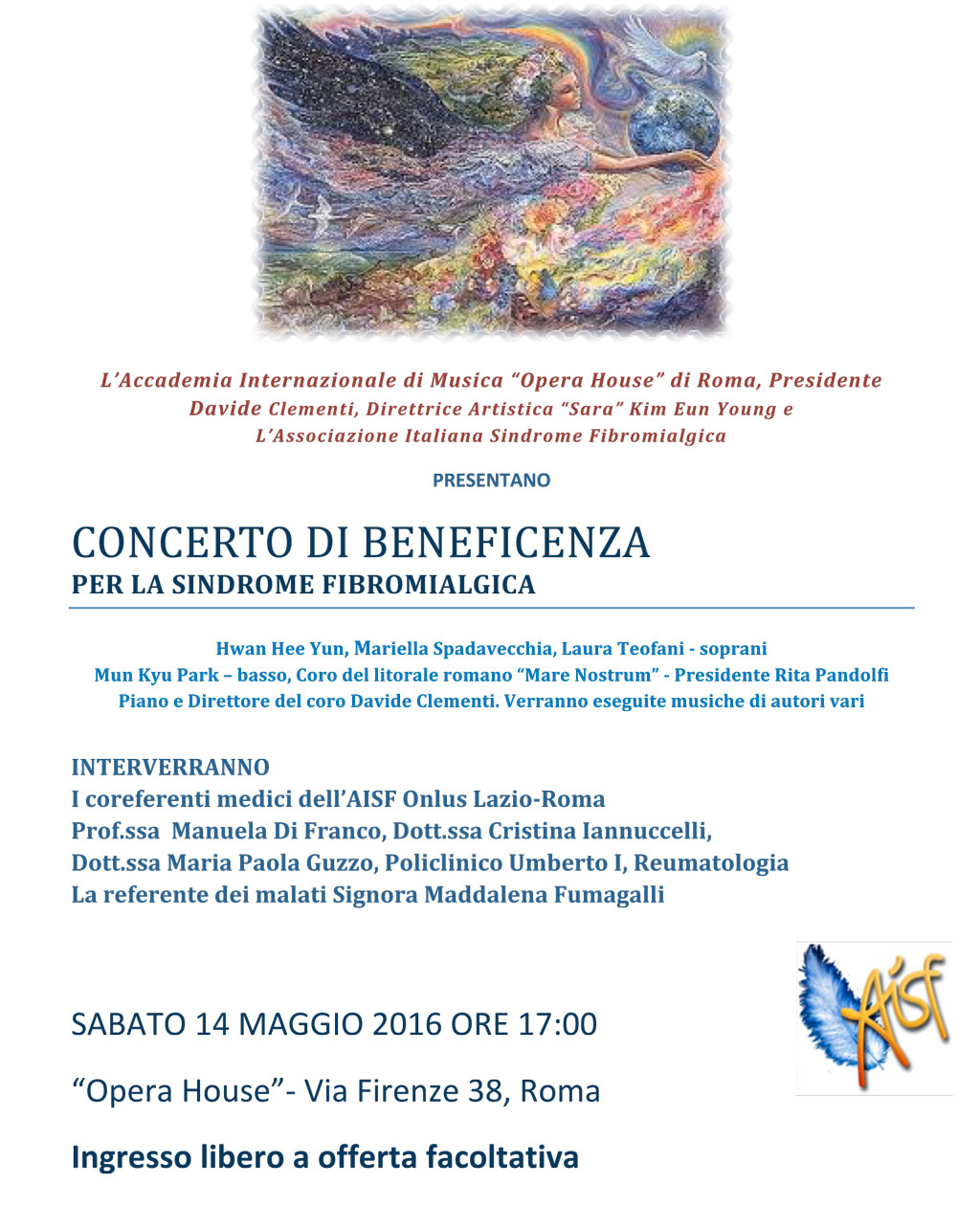 In occasione della prossima Giornata Mondiale della Fibromilagia, la Sezione Lazio dell’AISF (Associazione Italiana Sindrome Fibromialgica), partner della Fondazione Isal, organizza un Concerto di beneficenza all’ “Opera House” di Roma il 14 maggio alle ore 17,00.